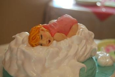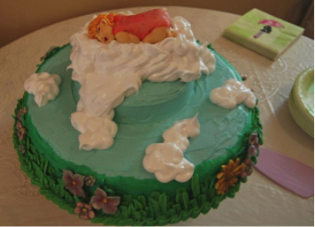 Details: This cake has a mixture of buttercream frosting, fluffy boiled icing, and hand molded & painted modeling chocolate flowers & baby.