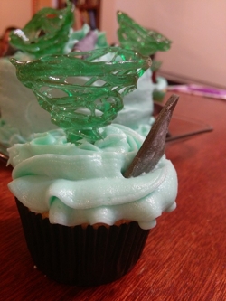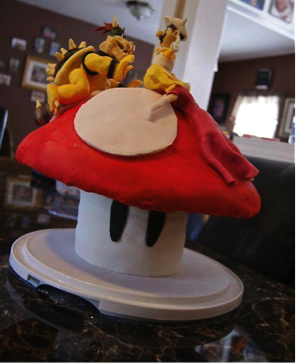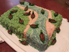 Details (Right Picture): The full cake with all modeling chocolate figures. The grass is a buttercream frosting. The water and lava is a boiled fluffy frosting. The cake is carved from cake and rice krispie treats.