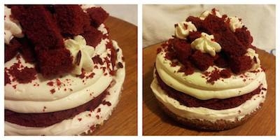 Details (Center Picture): Graham cracker crust, red velvet cake layers, and piped cool whip cheesecake.