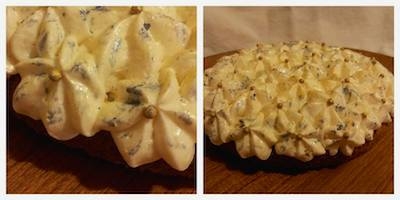 Details (Left Picture): Graham cracker crust with piped cool whip cheesecake topping, purple sparkle dust, and gold pearl candies.
