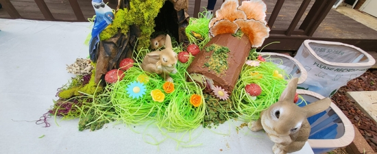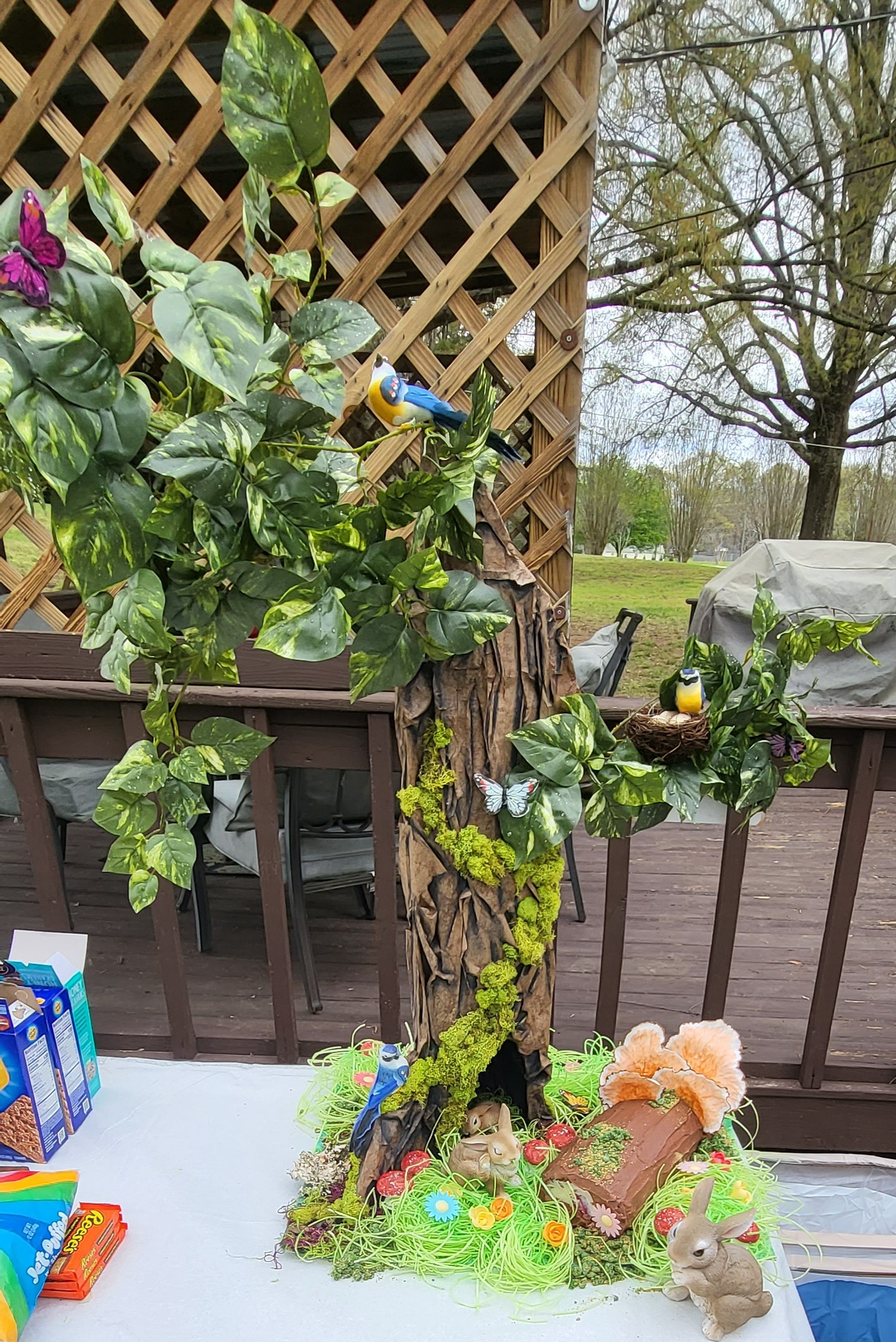 Detail: Keepsake papermache tree is painted, moss/leaves/animals from Hobby Lobby